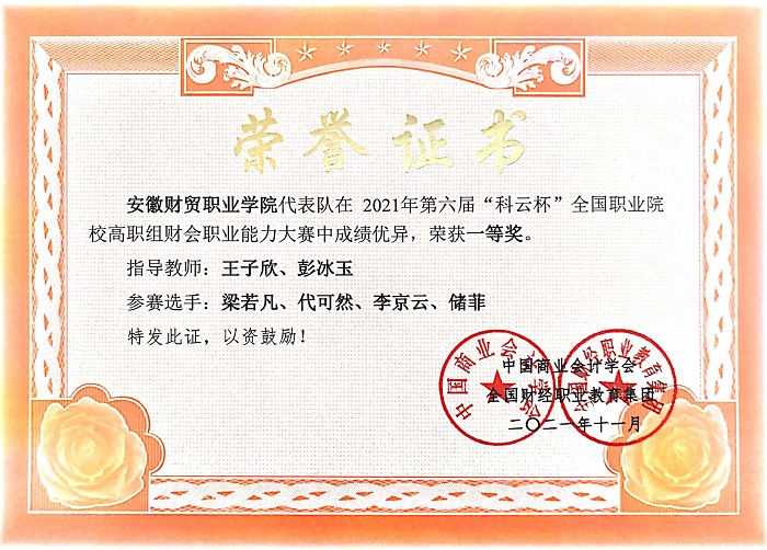 日前,由中国商业会计学会、全国财经职业教育集团主办,厦门科云信息科技有限公司承办的2021年第六届“科云杯”全国职业院校高职组财会职业能力大赛顺利举行,来自全国的500多支代表队脱颖而出,角逐全国决赛。beat365在线唯一官网财会金融学院黄昇雄、廖明宽、赵子琪、韩俊丽团队及梁若凡、代可然、储菲、李京云团队,双双荣获一等奖。
