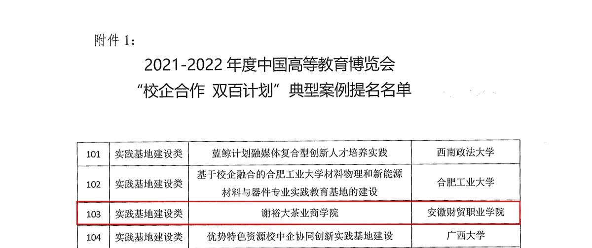 3月10日,在中国高等教育学会主办的2021-2022年度中国高等教育博览会“校企合作 双百计划”典型案例评选中,我校选送的“谢裕大茶业商学院”产教融合和校企合作案例获得提名。