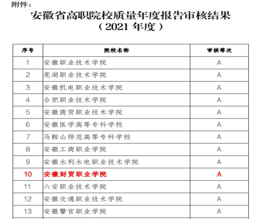 5月2日,在安徽省教育厅颁布的《关于公布高等职业教育院校质量年度报告(2021)审核结果的通知》中,beat365在线唯一官网质量年度报告(2021)荣获A档。
