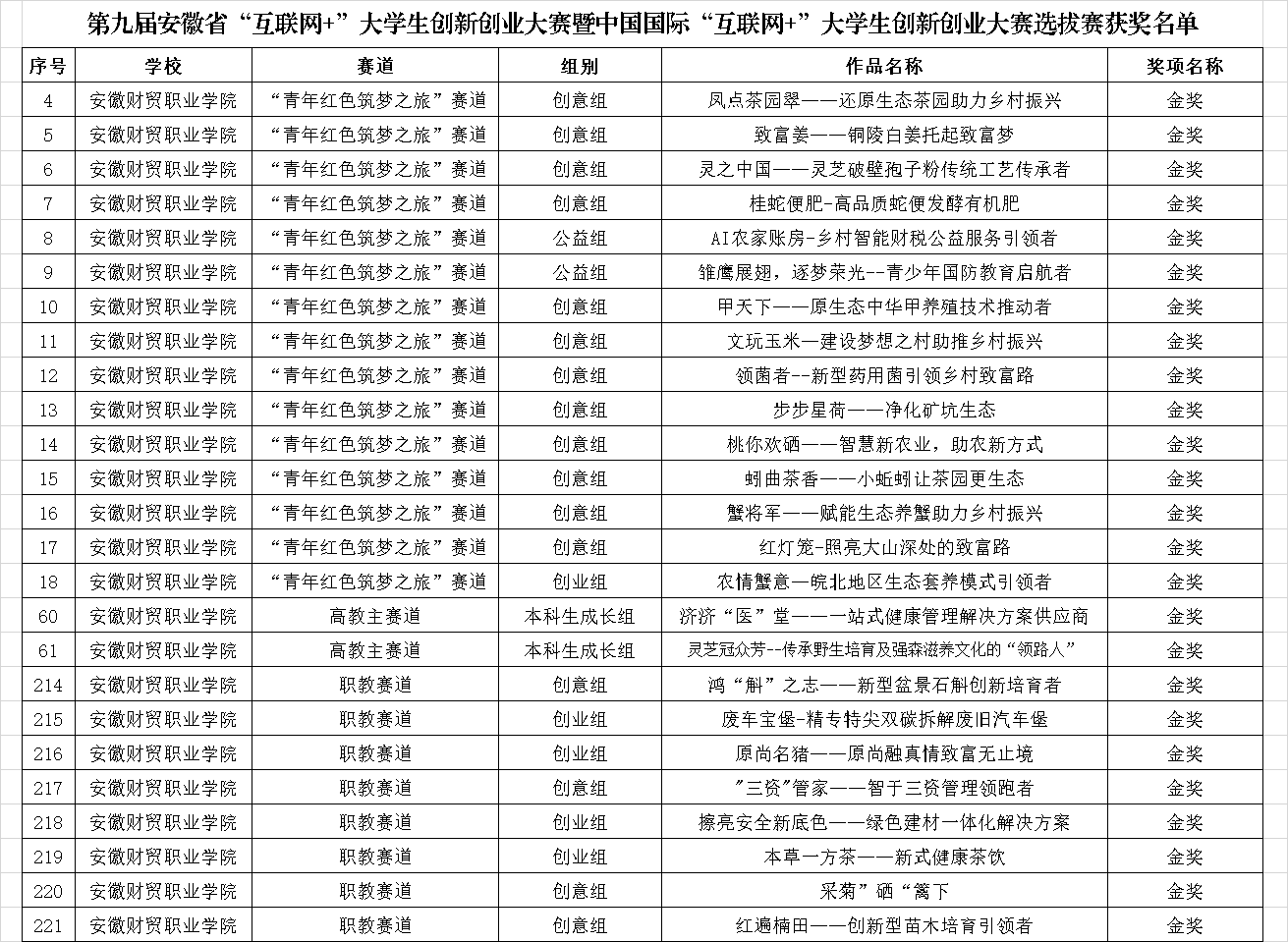 近日,安徽省教育厅公布了第九届安徽省“互联网+”大学生创新创业大赛获奖名单,beat365在线唯一官网获金奖25项,银奖31项,铜奖42项,6个项目通过遴选推荐参加国赛,学校获评“优秀组织奖”。金奖数与获奖数均位居全省高职院校首位。