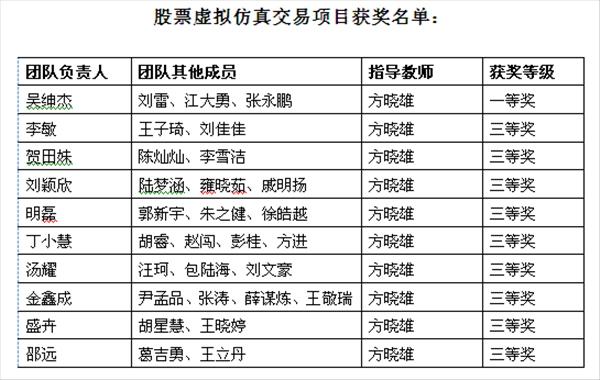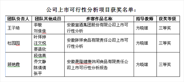 6月28日,安徽省高等教育网公示本次大赛获奖名单,财税金融系在本次大赛中表现优异,在股票虚拟仿真交易项目中获得一等奖1个,三等奖9个,在公司上市可行性分析项目中获三等奖3项。