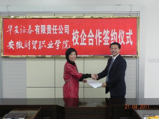 4月21日上午,财税金融系与华安证券有限公司合肥金寨路营业部在学院第二会议室举行了校企合作授牌仪式。财税金融系主任邓庆安主持,该公司营业部总经理裴磊、学院办公室主任罗虹、招生就业处副处长王永平、财税金融系党总支副书记李秀珍等应邀出席授牌仪式。