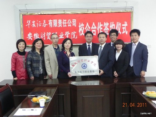 罗虹主任致欢迎辞并介绍了我院发展现状;裴磊总经理介绍了华安公司概况、营业部和财税金融系合作进展情况;王永平副处长代表学院向营业部授牌,至此,双方友好合作,共同致力于实习实训基地和人才培养基地的建设。随后,裴总一行饶有兴致地参观了我院徽文化广场、股票模拟交易大厅、徽商文化展厅等。