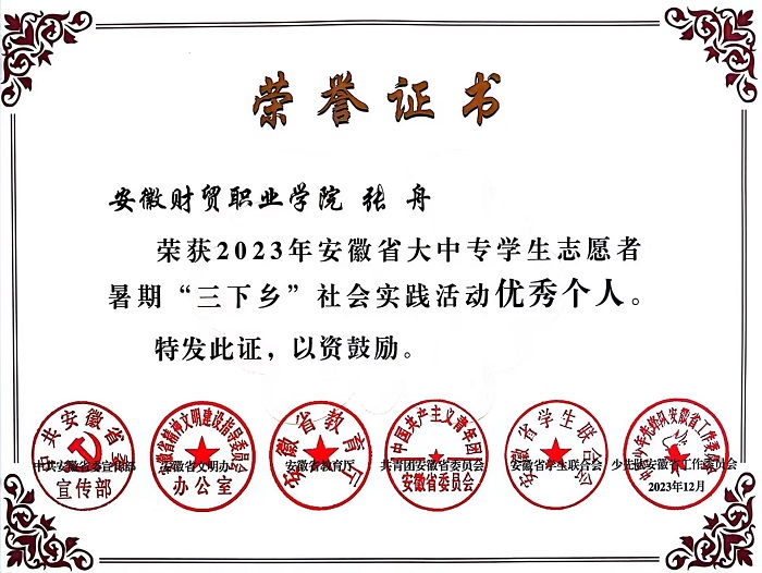 近日,在2023年安徽省大中专学生志愿者暑期文化科技卫生“三下乡”社会实践活动评选中,财会金融学院财税2102班张舟同学荣获社会实践活动“优秀个人”。