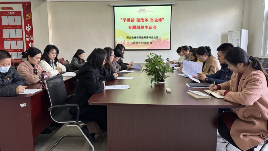 11月27日下午,财会金融学院教师第四党支部召开了“学讲话 促改革 当先锋”专题组织生活会,会议由支部书记葛瑶主持,支部全体党员教师参加,财会金融学院党总支组织委员李林育列席参会。