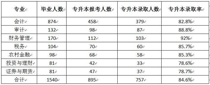 财会金融学院2020年专升本录取率再创历史新高,共有757名同学成功被安徽财经大学、安徽师范大学、安徽工程大学、安徽农业大学、合肥师范学院等本科院校录取,专升本录取率达84.6%。会计专业中外合作班共12名同学赴爱尔兰阿斯隆理工学院继续深造;会计1702班31109宿舍、会计1704班31123宿舍、会计1705班31204宿舍、会计1710班11501宿舍、审计1703班11205宿舍、审计1701班31305、31310宿舍、财务1701班41103宿舍、财务1703班41517宿舍的75名同学全部录取。