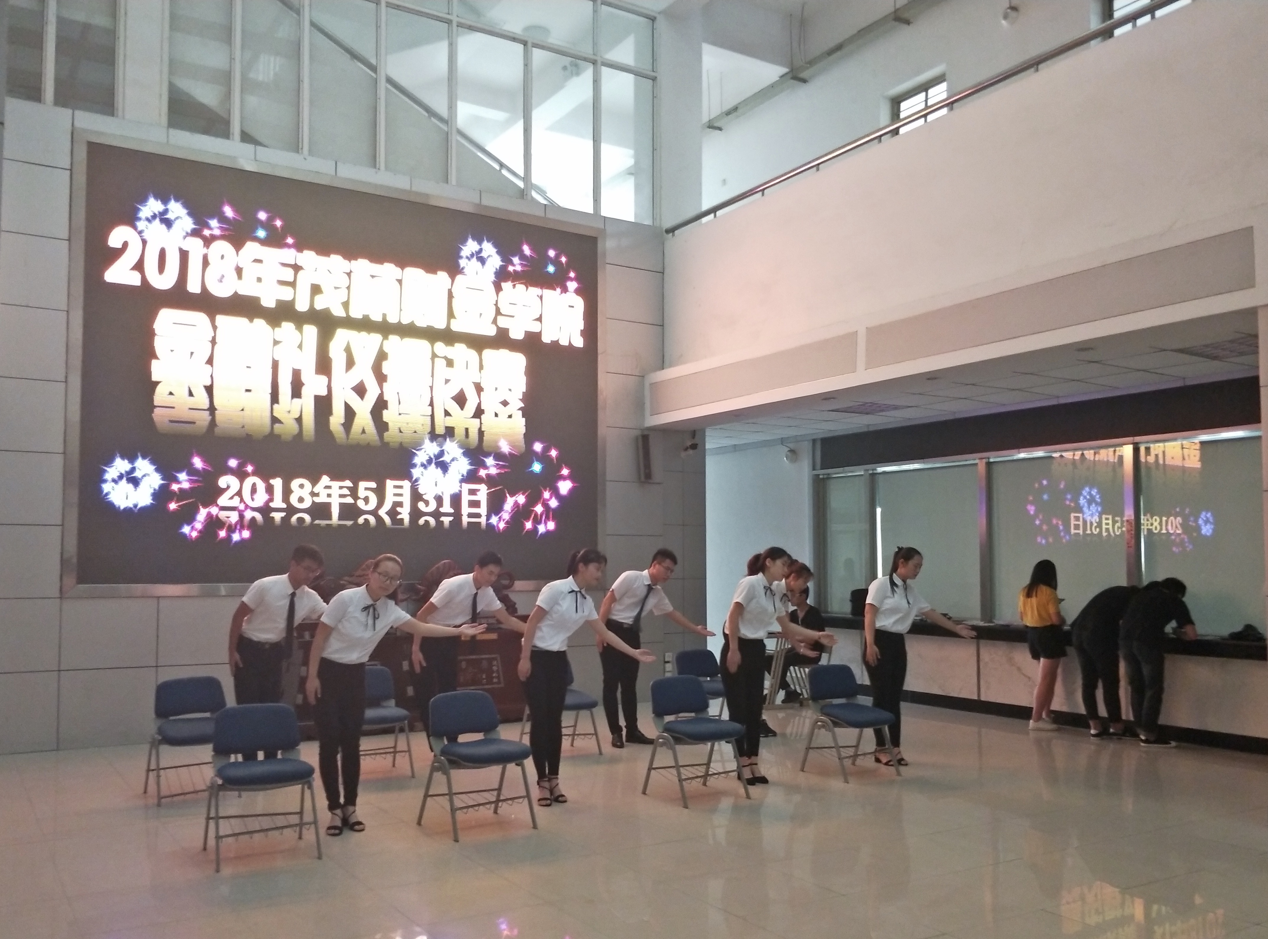 为强化教育金融礼仪知识,展现良好文明礼仪风范,5月31日中午,茂荫财金学院在实训楼证券模拟大厅隆重举行了金融礼仪操大赛。专职教师杨梓、专职辅导员童杰、李林育、胡云芳、学生秘书李彧佳老师担任此次大赛的评委。