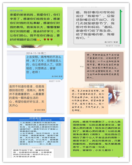 在同学们的感恩短信中,有的是发给父母感恩养育之恩,有的是发给师长感恩多年教导,有的是发给密友感恩常年陪伴,有的是发给朋辈感恩相互鼓励。朴实的语言,透出的是真挚的情感。