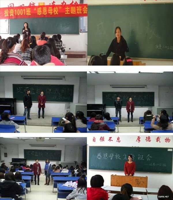 近日,2013届毕业生陆续离校。前夕,财税金融系组织各毕业班召开“感恩母校,文明离校”主题班会,引导毕业班学生常怀感恩之心。 班会倡导离校时毕业生离校时做到“三个留下”: 为母校留下完美印象、为低年级同学留下学习榜样、为自己留下美好回忆。会上,同学们追忆往昔畅谈同窗之情、共叙师生友谊,情深之时不禁热泪盈眶。 通过开展主题教育活动,增进毕业生对母校的感情,积极营造健康、文明、和谐的毕业生离校氛围,达到“真情留母校,文明踏社会”的目的。