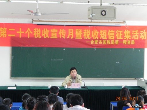 胡戴新副院长代表全院师生致辞,对合肥市稽查局的到来表示欢迎,要求广大师生加强税收宣传,围绕活动主题“税收 发展 民生”积极参与税收短信征集活动,并预祝活动取得圆满成功。