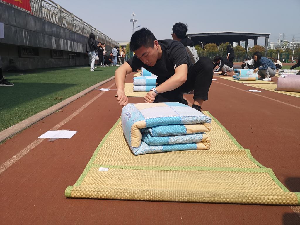 3月23日,学院在田径场举办了第二届叠军被大赛决赛,比赛分为大一大二组,共计111名选手参赛,经层层选拔各组最终有15名选手参加决赛。比赛在紧张激烈的氛围中开始,同学们认真细致、一丝不苟地将被子每一层压紧、每一角抚平,短短15分钟时间,一床床被子在同学们手中就变成了有棱有角的“豆腐块”。