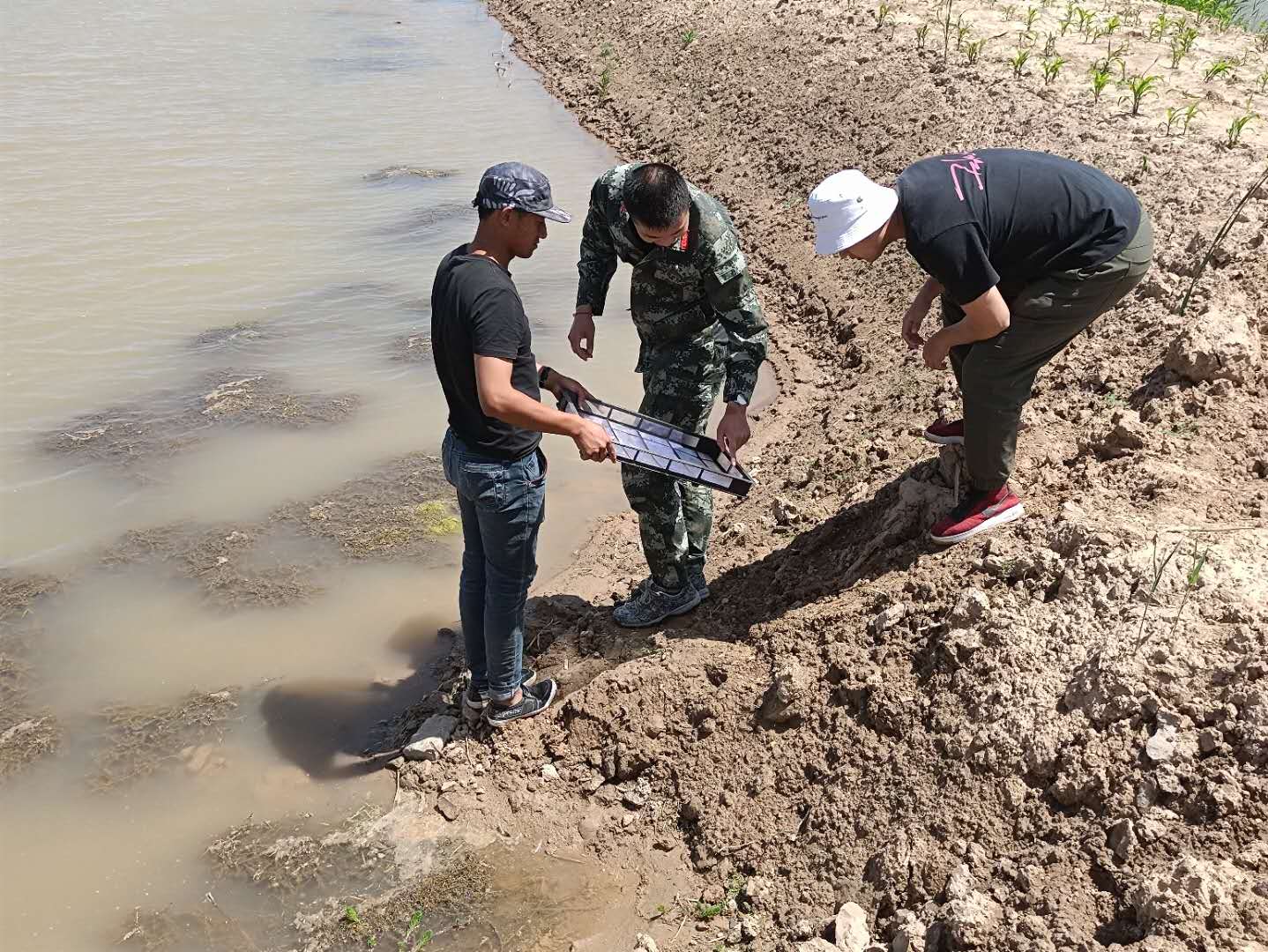 抵达养殖基地后,钟浩然同学热情地带领团队参观他的蟹塘,介绍水产养殖的特点、科普龙虾和螃蟹等的生活习性知识以及当地矿区的环境修复历程;并仔细地介绍他的鱼虾蟹生态养殖模式,展示了他目前为适应当地环境特别培育的蟹苗和虾苗。