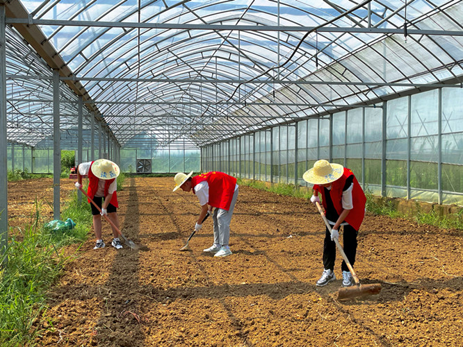 由当地农场负责人孙阳阳分配工作,农场导师何业宁带领团队,进行情圆农场除草、农耕、翻地、仓库盘存等实践活动,采取实践体验和理论知识相结合的方法,为团队成员介绍农场情况讲解农场知识,同学们在炎炎烈日下体验了农耕生活。马郢社区每周末是研学以及团建的高峰,团队成员在经过一系列的培训后,跟随研学团队深入基地,开展志愿服务。