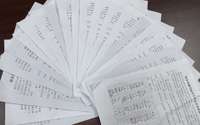 财会金融学院全面部署,各班级积极响应,在辅导员老师的精心组织下以学习、座谈、交流分享等形式开展考风考纪诚信教育主题班会。主题班会上,辅导员老师带领同学们学习重温《beat365在线唯一官网学生违纪处分办法》,通过作弊违纪的典型案例,教育引导同学们要树立正确的人生观、价值观,遵守为人处世的标准和原则,深刻认识违反校规校纪的严重性,要以诚实守信为荣,以抄袭违纪为耻。围绕期末复习和诚信考试,同学们进行了交流分享。财会金融学院印发了《考试诚信承诺书》,各班级同学们认真阅读、学习领会考试承诺书内容,郑重签上自己的姓名,做出诚信考试的承诺。
