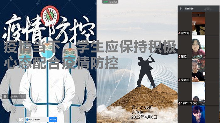 为提高学生防疫意识,引导学生以积极的心态做好疫情防控,财会金融学院开展以“疫情当下,学生应保持积极向上的心态配合疫情防控”主题线上口训。