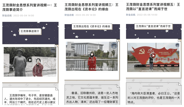 5月4日至6日,王茂荫财金思想学习研究会通过财会金融学院微信公众号“财金启航”开展线上学习宣讲活动,推出5期王茂荫财金思想系列宣讲微视频,对王茂荫财金思想进行线上传播。