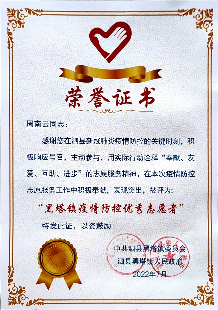 2022年的暑期酷暑高温,在学院大学生暑期社会实践“返家乡”“做贡献”的号召下,财会金融学院互金2003班周南云同学连续两年积极参加黑塔镇返乡大学生暑期社会实践,并获得该镇新时代文明实践所优秀志愿者荣誉称号。