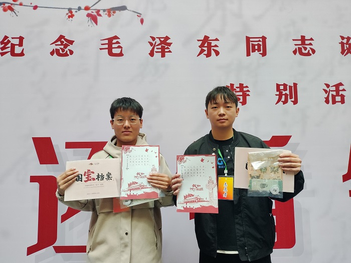 安徽博物院是毛泽东同志唯一公开视察并作出重要指示的省级博物馆,在毛泽东诞辰130周年之际,安徽博物院推出“还看今朝”特别活动。在“吟诵品经典”的环节中,特邀教授张器友为同学们深度解读《七绝·改诗赠父亲》《沁园春·长沙》等毛泽东诗词的诗意、诗情、诗美,同学们感受到诗词的豪迈与大气,不禁感慨诗词历经百年,是传承亦是经典。带着深入的理解,同学们积极参与了“挥毫敬伟人”“走笔展心意”的环节,现场认真书写毛泽东经典诗词,透过一笔一画,一词一句,书写今朝的蓬勃新生力。活动结束后,同学们还参观了安徽文明史馆、安徽建筑馆以及文房四宝馆等。