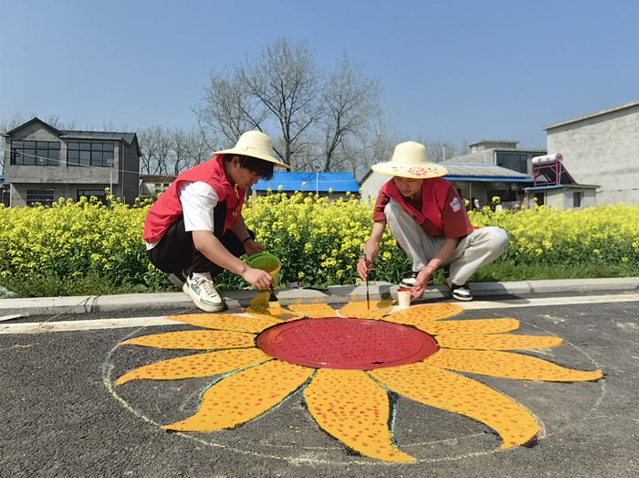 活动伊始,共创营项目丁琳静老师、胡亮老师分别为同学们介绍了张岗村的村情村貌、特色亮点和建设规划,激发同学们对乡村的元素共创。在乡村的实地勘查中,积极展开讨论,完成创意设计和任务分配。志愿者用手中的调色盘点燃了张岗村春天的色彩,手中的画笔勾勒出新时代的乡村风貌。跳方格是孩子们快乐家园,春天的脚印是幸福的开始,斑点狗是乡村的守护者,小火车是驶向新时代的列车,向日葵是向阳而生的姿态……“我为乡村绘风景”绘出了张岗村振兴的新活力!