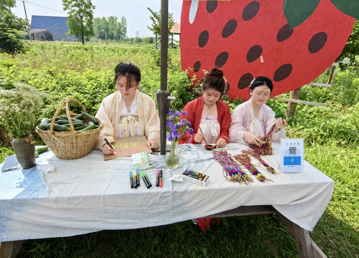 志愿者身着传统服饰在农场的各个体验点进行端午研学行的引导,系五彩绳、点雄黄、送祝福、古筝表演、农事体验教学等服务让四十多名家长和孩子们感受到了乡村端午节的别样氛围。志愿者们还带领孩子们一起挂灯笼、挖土豆、钓龙虾等乡村特色项目的体验,给孩子们介绍了端午的由来,乡村过节的民俗。