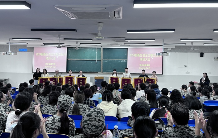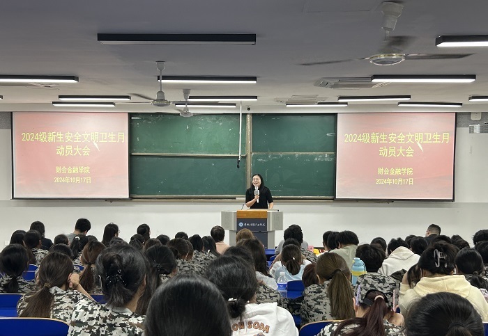 10月17日,财会金融学院组织召开2024级安全文明卫生月动员大会,党总支书记胡宏萱、副书记左艳琼、团总支书记沈丽萍、全体新生班级辅导员老师以及团学干部、新生班级班长、寝室长参加会议。