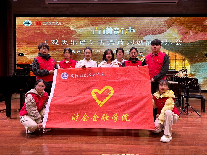 11月23日下午,财会金融学院7名志愿者在专职辅导员老师夏敏的带领下走进安徽博物院“古谱新声”诗词音乐会现场开展志愿活动,聆听古谱音乐,弘扬传统文化。
