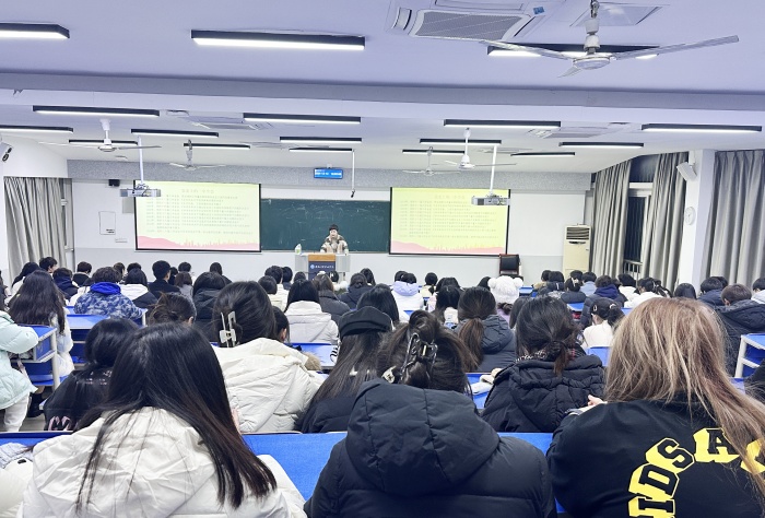 12月12日晚,财会金融学院党总支书记胡宏萱在5102教室作《形势与政策》专题报告,各班级团干及入党积极分子参加报告会。