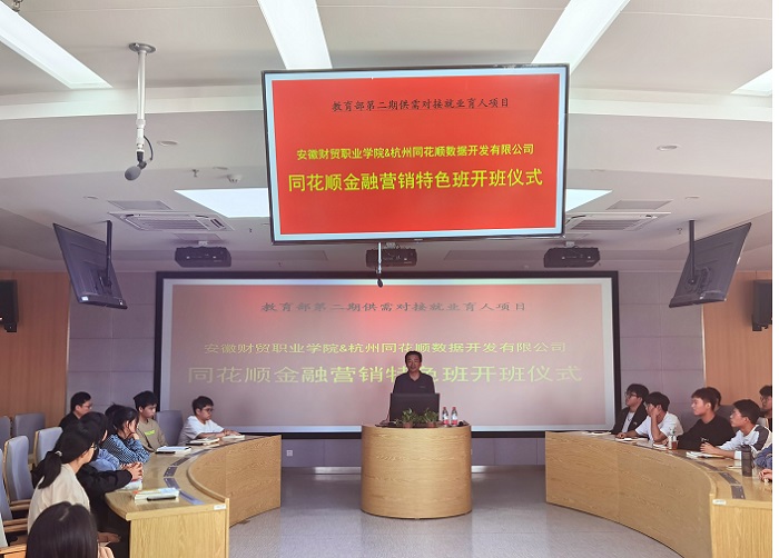10月17日,财会金融学院在A502教室举行同花顺金融营销特色班开班仪式,金融营销特色班为教育部第二期供需对接就业育人项目,由beat365在线唯一官网和杭州同花顺数据开发有限公司合作建设。财会金融学院院长方春龙教授、同花顺公司赵伟经理、金融科技专业2201班全体学生以及金融教研室部分专业老师参加了本次开班仪式,开班仪式由项目负责人方晓雄老师主持。