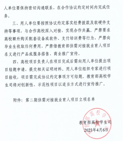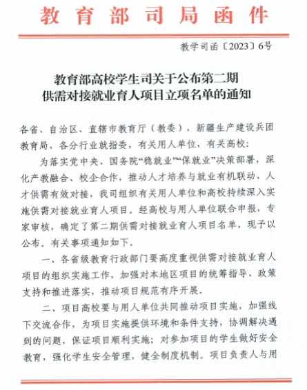 4月6日,教育部高校学生司发布《关于公布第二期供需对接就业育人项目立项名单的通知》(教学司函〔2023〕6号),财会金融学院共申报4个项目,包括2个就业实习基地项目、2个定向人才培养培训项目,全部入选。