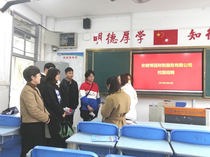 3月22日下午,财会金融学院在1号教学楼举办2023年春季首场校园招聘会,此次校园招聘会邀请了安徽博强财税服务有限公司、安徽合肥融博商务咨询有限公司、安徽腾信企服集团等10余家校企合作用人单位来校,为2021级同学们提供财务管理、会计、审计、金融服务等实习就业岗位,2023届毕业生通过线上参加校园招聘活动。