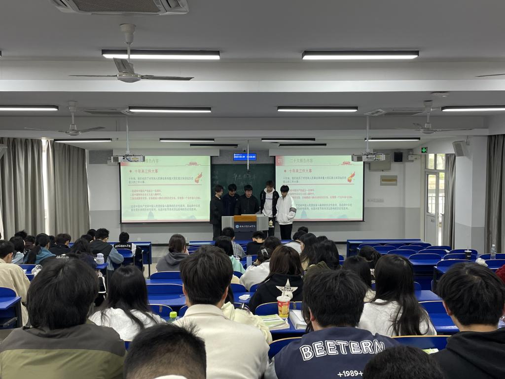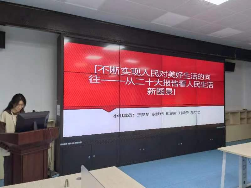 各实训小组成员分工合作,呈现了一次有意义的翻转课堂教学。有的小组制作了图文并茂的PPT汇报材料,向同学们分享了学习贯彻党的二十大精神的心得体会以及青年大学生应当如何思考和规划自己的人生之路;有的小组拍摄了短视频,以情景剧的形式表达了他们对人生价值的理解和青春报国的志向;有的小组以唱红歌、朗诵诗歌的形式,传达青年人的心声。