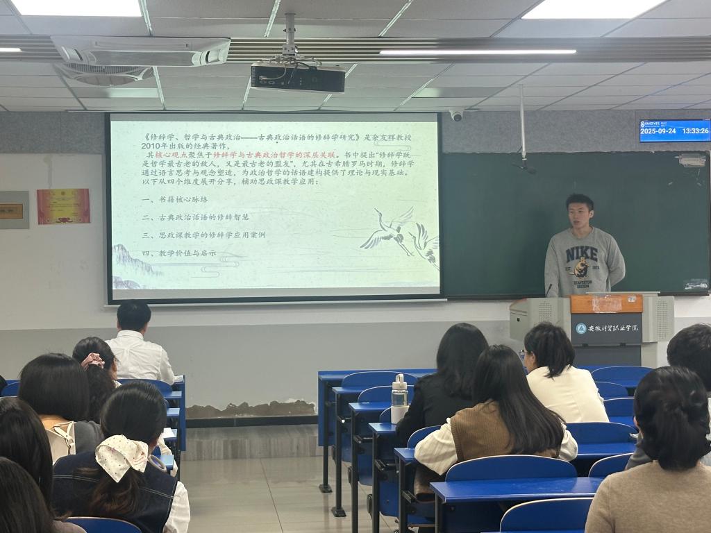 孙中天老师以《修辞学、哲学与古典政治——古典政治话语的修辞学研究》专著为例,探讨古典政治话语的修辞学在思政课教学中的应用。王爱林、包越老师聚焦青年教师教学创新能力提升,提出实践性建议。韦瑶、高亚云老师分享暑期培训成果,为思政课教学注入新理念。王荟老师以“AI赋能思政课教学模式创新”为主题,展示技术融合教学的实践路径。周大然博士解读中国特色社会主义法治核心要义,深化理论认知。张成成老师结合国防动员主题,探讨思政教育与国防教育的融合策略。