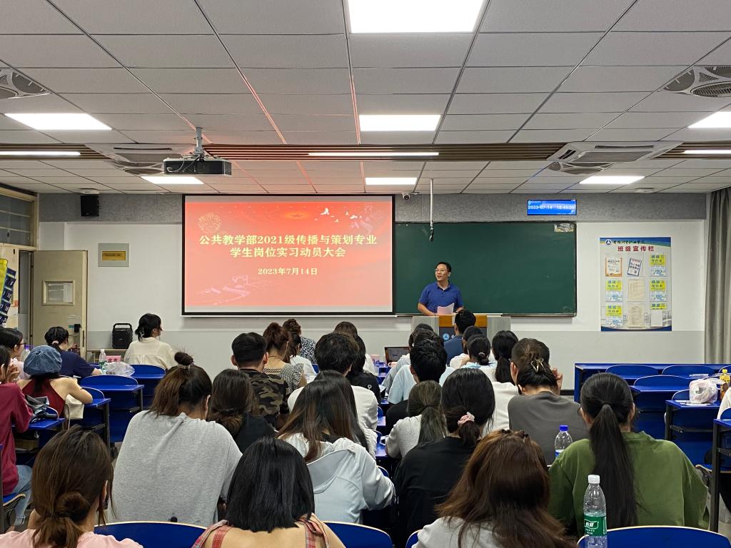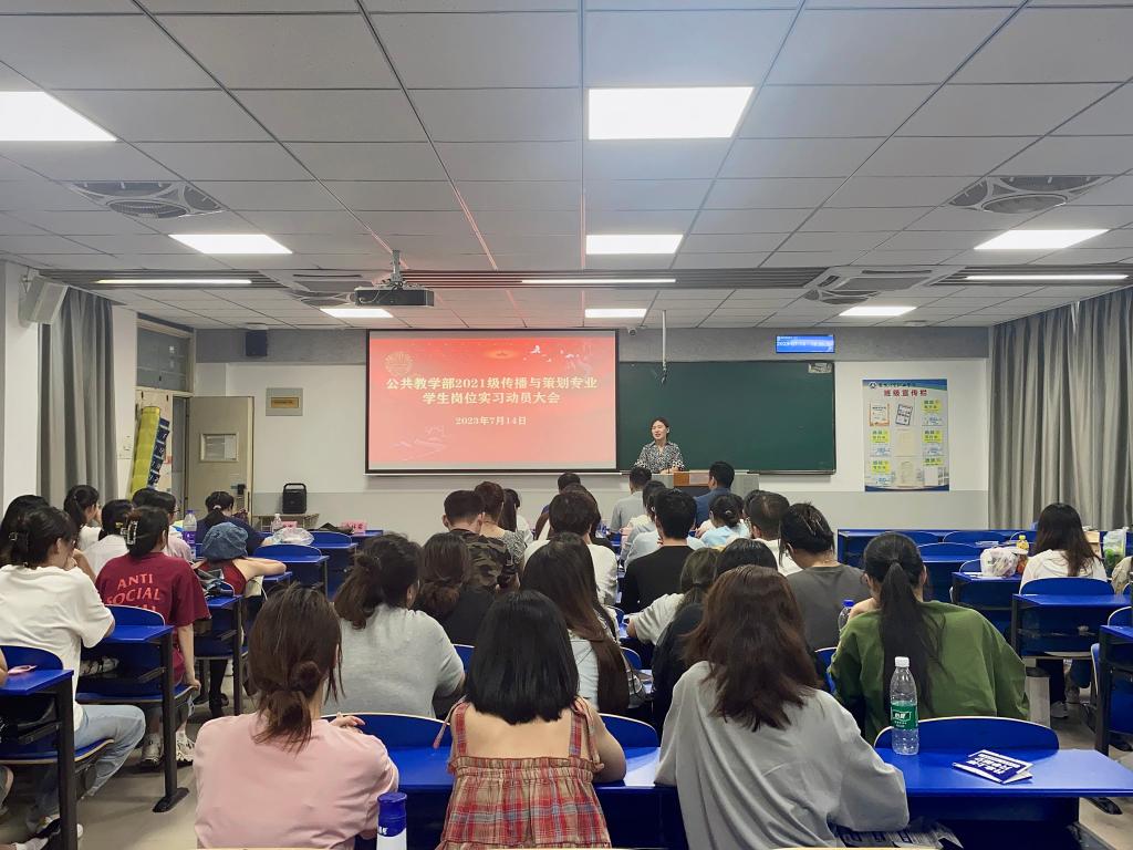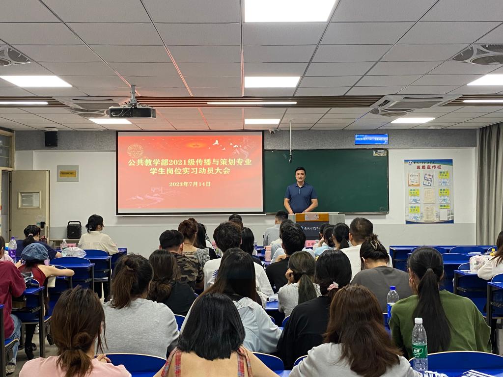 为进一步完善岗位实习工作,引导学生做好岗位实习准备,推进实习工作的顺利进行,7月14日晚,公共教学部在4106教室召开2021级传播与策划专业岗位实习动员会。公共教学部主任王学峰、党总支副书记何步新、安徽凯福佑集团直播产业运营合伙人吴海以及2021级传播与策划专业全体师生出席了会议,会议由教研室主任赵倩主持。