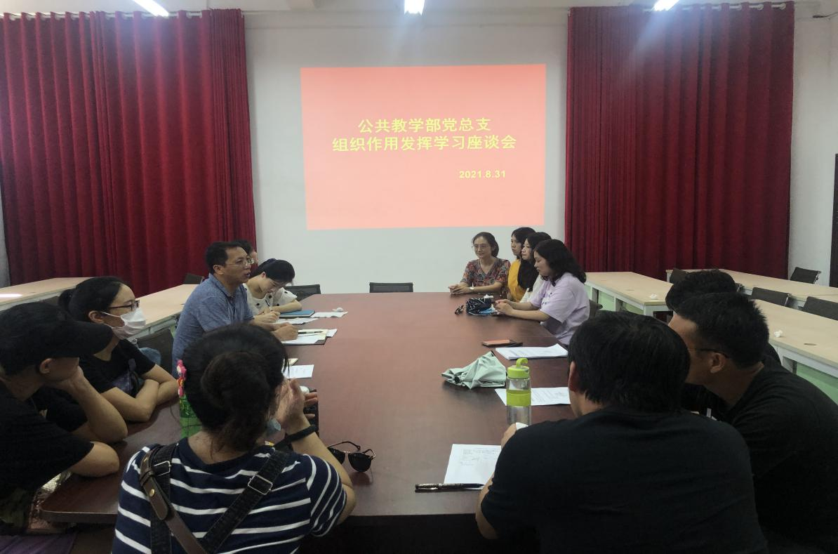 8月31日,公共教学部党总支进行主题党日和学习交流活动,学习《中国共产党普通高等学校基层组织工作条例》、《beat365在线唯一官网二级院部党组织作用发挥工程实施方案》等法规文件并进行座谈。党总支副书记何步新主持会议,教师党支部、学生党支部在校党员参加了此次会议。