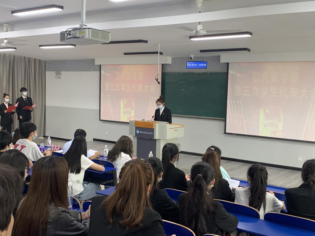 5月25日下午,公共教学部第三次学生代表大会在6202教室召开。公共教学部党总支副书记何步新、副主任陈伟、办公室主任杨志祥、团总支书记赵慧以及教师代表出席会议,共有学生代表45人参加本次大会。