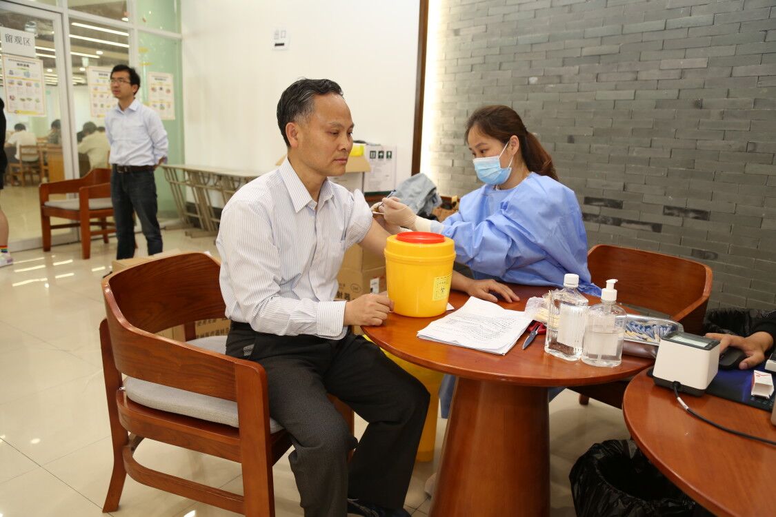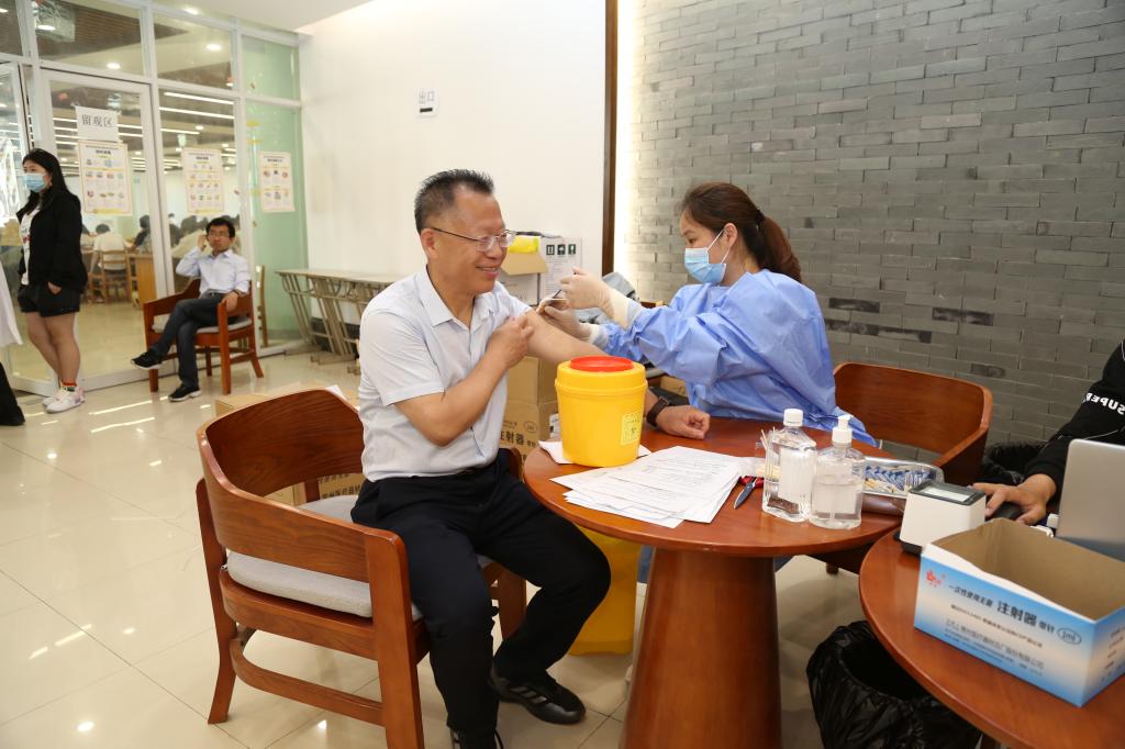 在医务人员和志愿者的指引下,学校领导依次出示身份证,填写疫苗接种知情同意书,接受医务人员的询问,在充分沟通相关信息后,医务人员为校领导接种了新冠疫苗。接种完成之后,校领导按照要求来到留观区,留观30分钟。