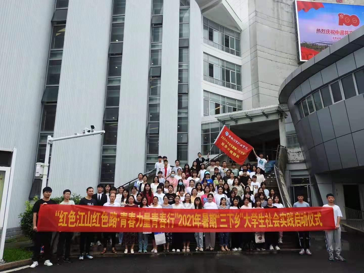 7月5日上午,学校在学术报告厅举行“红色江山红色路 青春力量青春行”2021年大学生暑期“三下乡”社会实践活动启动仪式。学校党委委员、副校长胡戴新出席仪式并为实践服务队授旗。学生处、团委、各院部党总支、团总支相关负责人及重点团队师生代表参加仪式。