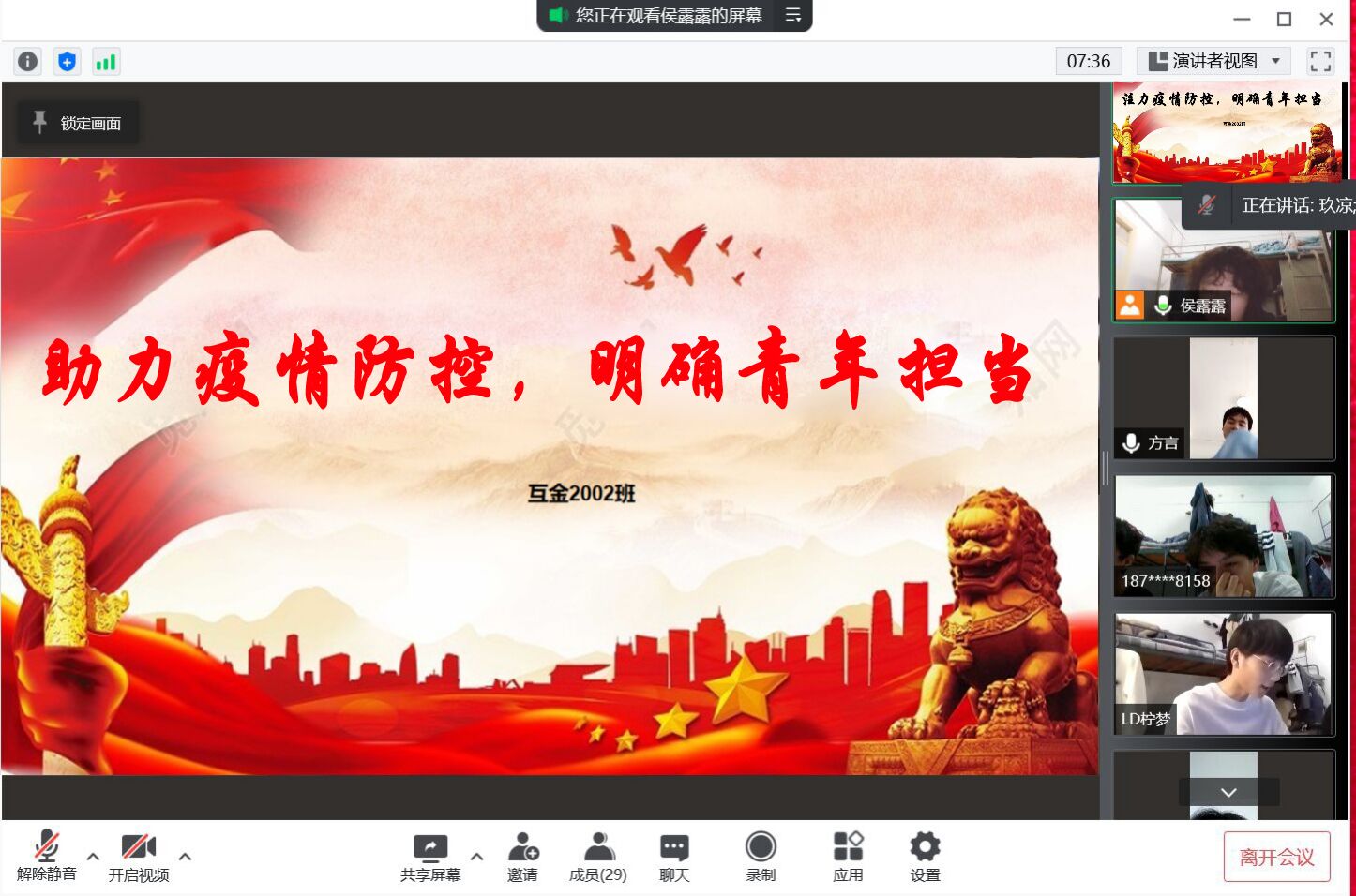 立即行动,坚定战“疫”信心。校团委组织开展“助力疫情防控,明确青年担当”主题团日活动,发挥团组织战斗堡垒作用。212个在校班级团支部积极组织学习《学生疫情防控期间学习生活健康指南》《违反疫情防控管理秩序的行为及法律后果明白纸》等文件精神,让同学们及时了解当下的疫情防控相关要求并严肃对待。坚持每日健康打卡,加强自我监测,网格化管理,积极配合所在学院做好信息排查,做好自己的“健康第一责任人”。