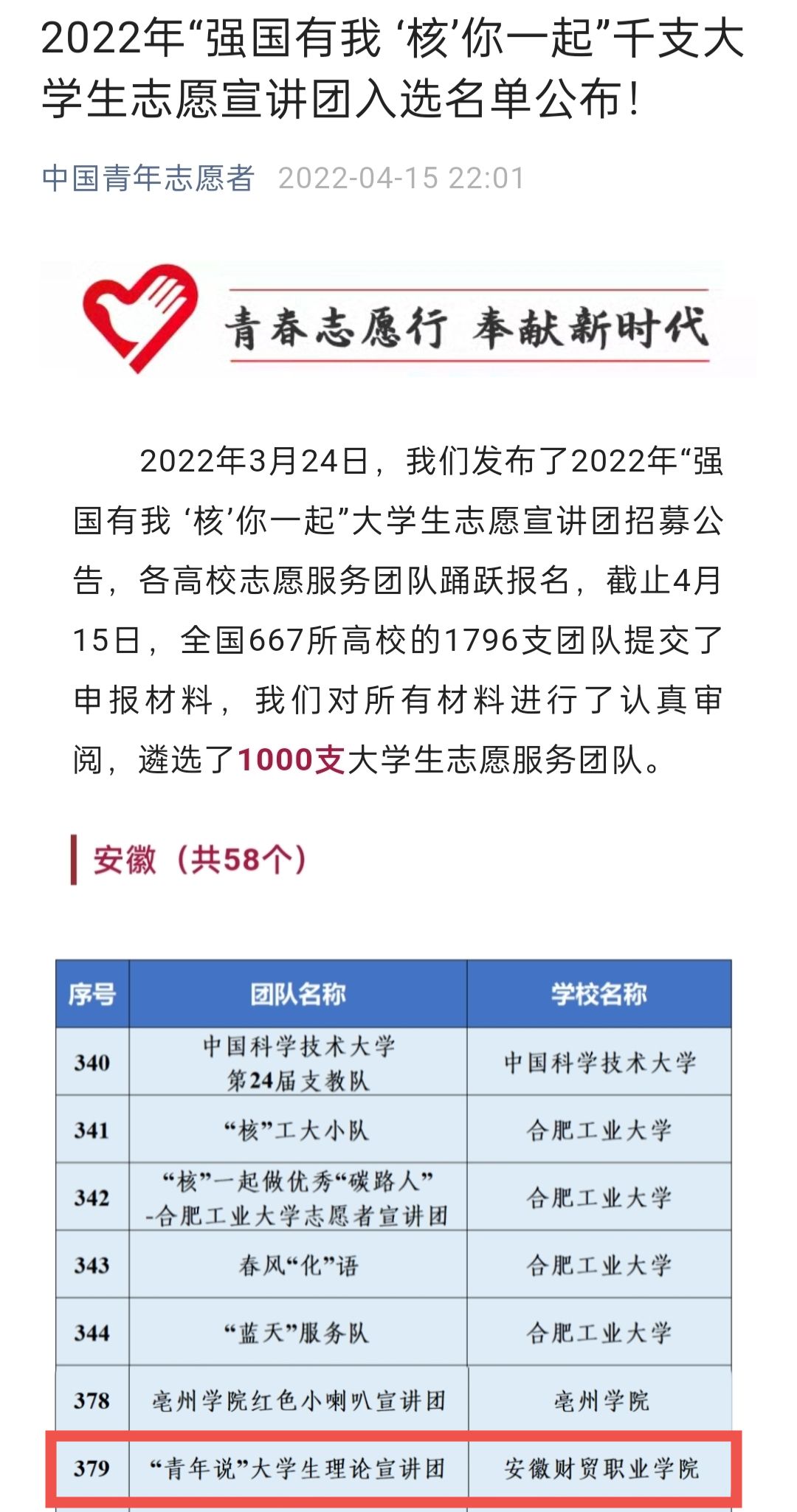 近日,团中央青年志愿者行动指导中心、中国核工业集团有限公司、中国青年志愿者协会秘书处联合公布了2022年“强国有我 ‘核’你一起”千支大学生志愿宣讲团入选名单,我校“青年说”志愿宣讲团从全国667所高校的1796支团队中脱颖而出,成功入选。