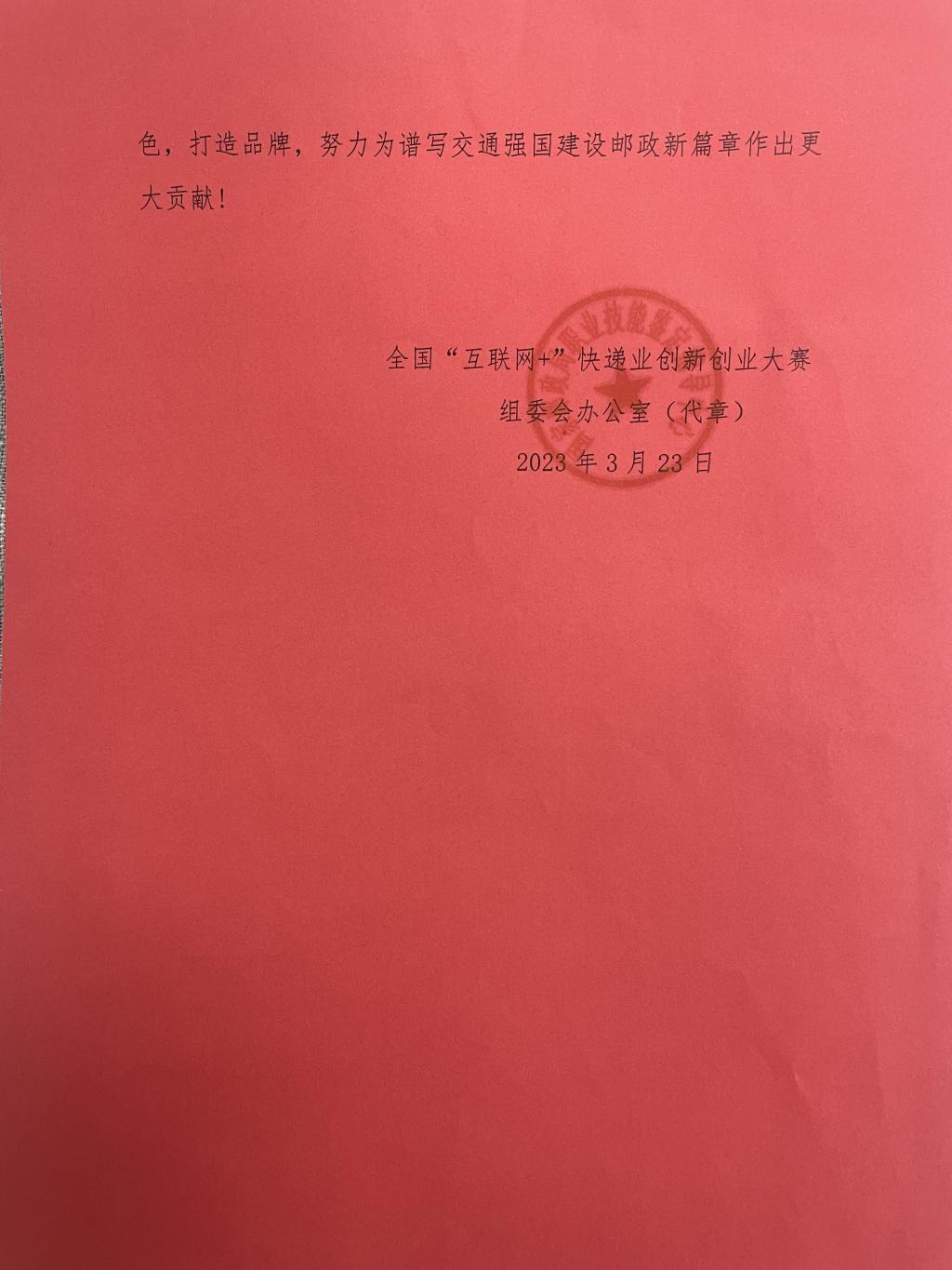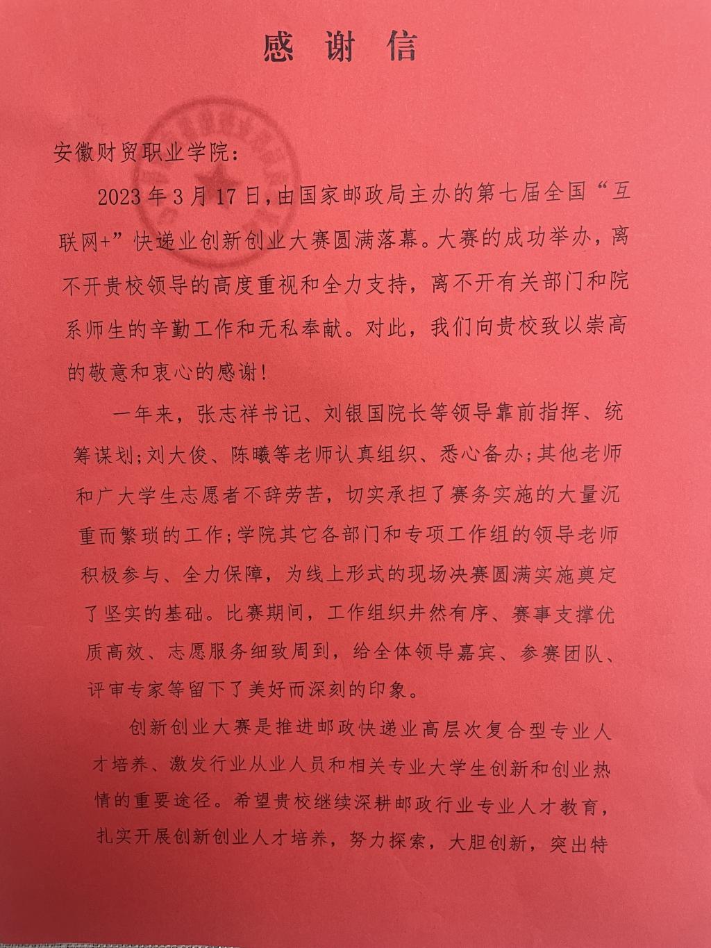 近日,全国“互联网+”快递业创新创业大赛组委会办公室发来感谢信,对我校的赛事承办工作予以充分肯定。