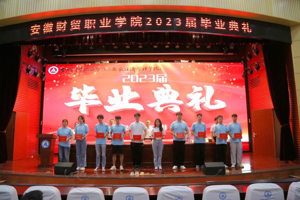 胡戴新宣读了2023年安徽省普通高等学校品学兼优毕业生、学校优秀毕业生表彰文件,学校领导为获奖学生代表颁奖。