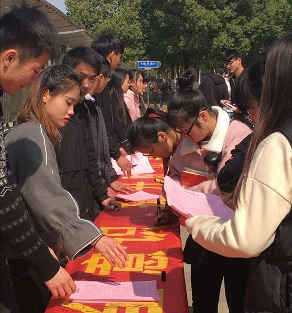 学院第十个安全卫生月于3月1日正式启动,当天中午,由学生处(团委)举办的大型签名活动在在西教学楼宣传栏前举行,过往同学纷纷在印有“增强安全意识,提升财贸素养,优化育人环境,构建和谐校园”的横幅上签名留言,许下自己共建美好校园的诺言。