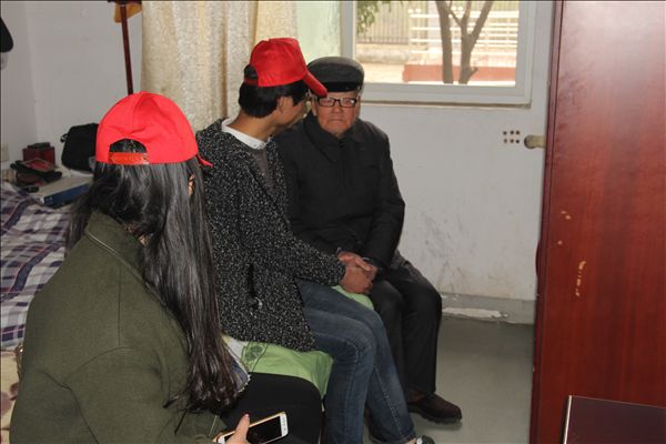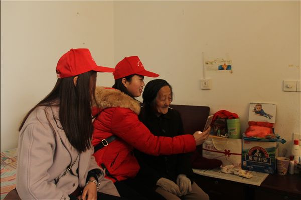 走进敬老院的大门,志愿者们发现老人们早已在院子里坐好,欢迎他们的到来。细心的志愿者们出发前还自发购买了水果、面包、点心等慰问品,表达对孤寡老人的一片心意。随着志愿者们的到来,敬老院里很快萦绕着欢声笑语,志愿者们有的到房间陪老人们拉家常、讲笑话、讲生活小常识、养生小知识;有的志愿者帮助老人整理内务、打扫卫生、为老人捶背、与老人“玩自拍”等;有的志愿者到户外和老人聊天,听老人讲过去,讨论现在,不仅使老人舒缓寂寞,也使自己感受到了教育。