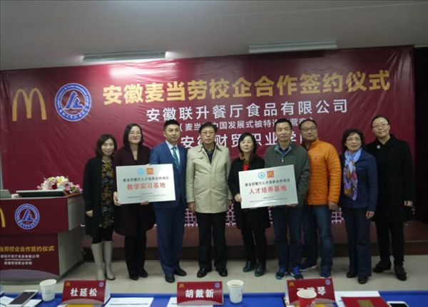 11月9日,学院与安徽联升餐厅食品有限公司(麦当劳中国发展式被特许经营商)举办校企合作签约授牌仪式,校企达成合作战略协议。安徽联升餐厅食品有限公司将为我院提供相关专业的实习基地,学院参与安徽麦当劳公司“麦苗计划”,校企共育“小麦苗”。