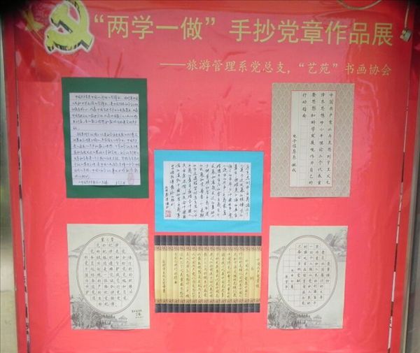 在庆祝建党九十五周年前夕,旅游管理系党总支与教职工社团“艺苑”书画协会创新“两学一做”学习教育形式,将书法艺术与党章党规学习相结合,推出手抄党章书法艺术汇报展。