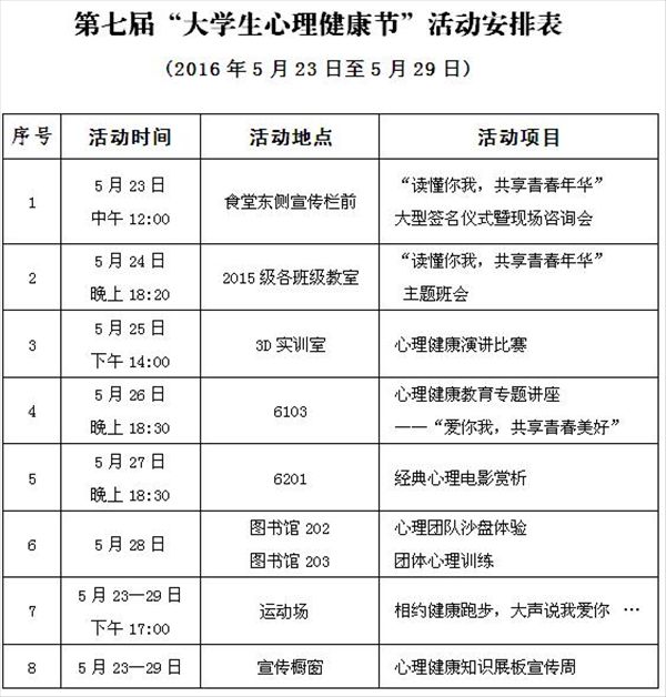 今年学院的心理健康节以“读懂你我,共享青春年华”为主题,将举办主题签名、现场咨询、主题班会、演讲比赛、专题讲座、电影赏析、心理沙盘、健康跑、心理知识展板宣传等活动。