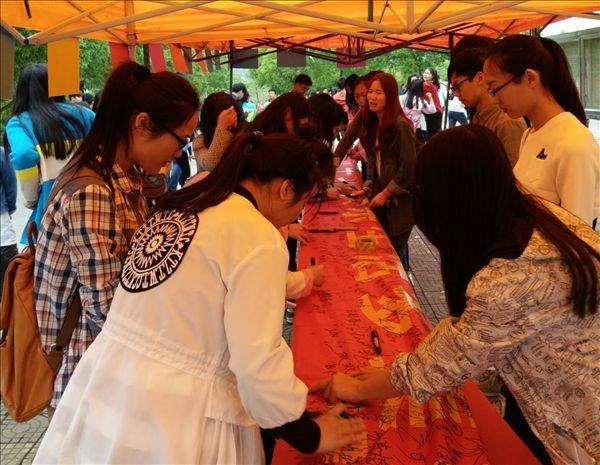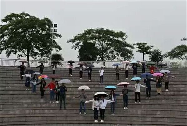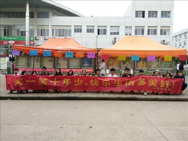 虽然微笑日当天细雨蒙蒙,但是同学们的微笑热情不减,不少同学主动在宣传横幅上签名,并争当微笑的传递者。心理协会的同学们还在学院露天剧场玩起了行为艺术,他们通过合作排出了笑脸图案和爱心图案,迎接世界微笑日的到来。