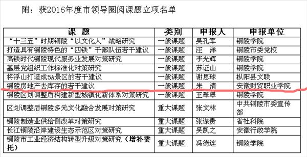 5月11日,由行知管理学院副教授朱清牵头负责、校内校外专家组成的课题组在铜陵市2016年市领导圈阅公开招标课题中获准立项,立项的课题名称为“铜陵市房地产去库存的若干建议”。