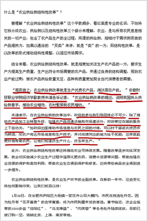 朱清在专栏中以通俗易懂、接地气的语言解释了晦涩的“供给侧”:“简而言之,农业供给侧改革就是生产优质农产品,淘汰落后产能。‘农业供给侧改革’的提出,说明我国将从供给侧着手,推动农业增效、农村繁荣和农民增收。”她的观点被专栏原话引用。