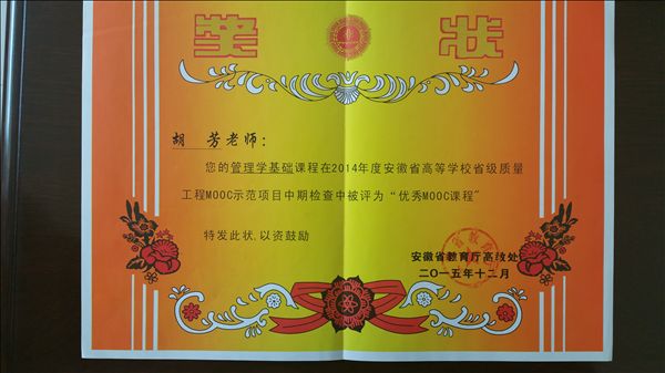 12月16 日下午,安徽省高校数字图书馆建设成就展暨安徽省网络课程学习中心平台开通仪式在中国科学技术大学举行。省教育厅公布了2014年度立项的安徽省省级质量工程首批MOOC示范项目的中期检查结果。学院行知管理学院方春龙老师的《经济学基础》和胡芳老师的《管理学基础》在检查中获得优秀等次。
